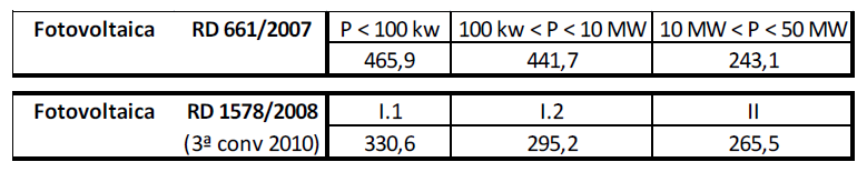 La Retribución que reciben los Productores de energía fotovoltaica es la que resulta de multiplicar la energía producida (kWh) por la Tarifa vigente en cada momento (€/MWh en la tabla):
