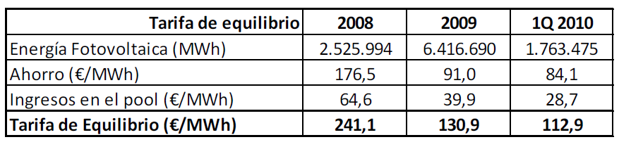 Esta tarifa de equilibrio es fuertemente dependiente del precio del pool. Para precios medios del pool del orden de los 55 – 60 €/MWh, que, con toda seguridad, se alcanzarán tan pronto como se recuperen valores normales de demanda energética (actualmente la demanda se ve afectada por la situación de crisis), la Tarifa de Equilibrio se sitúa por encima de los 200 €/MWh. Según la curva de evolución de costes de la Fotovoltaica, en el 2011 seráviable producir Energía Fotovoltaica a ese precio.