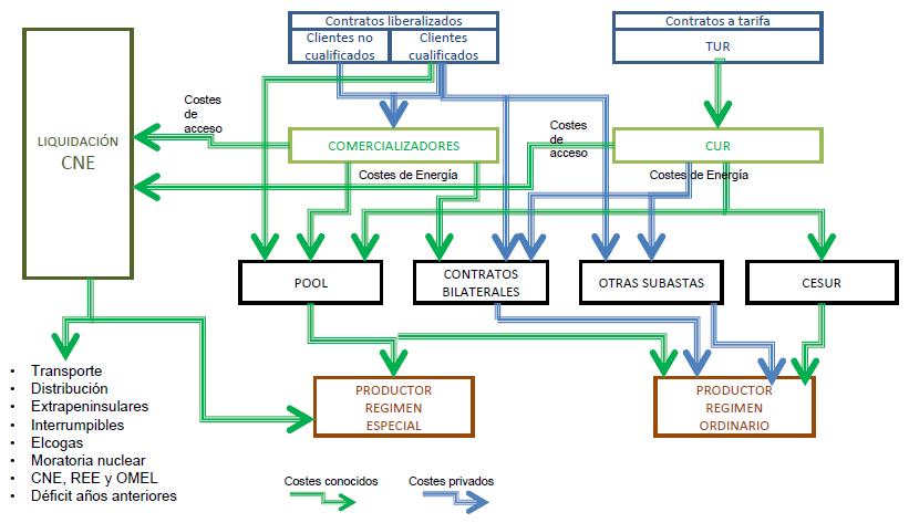 En el Suministro Regulado (TUR), el coste total de la tarifa es regulado, es decir, calculado por la CNE y establecido en el BOE por el Mityc (Ministerio de Industria). El Coste de la Energía se fija con las subastas CESUR, por lógica los precios resultantes son superiores al pool (mercado mayorista de electricidad), ya que incluyen una prima de riesgo. Esta ineficiencia supone un sobrecoste al consumidor (el precio del pool es alrededor de 7 €/MWh inferior al fijado en la subasta, en el 2009 supuso más de 700 Mill €)