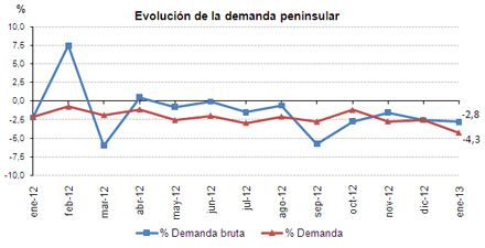 La demanda peninsular de energía eléctrica en enero, una vez tenidos en cuenta los efectos del calendario y las temperaturas, desciende un 4,3% con respecto al mismo mes del año anterior. La demanda bruta ha sido de 22.474 GWh, un 2,8% inferior a la de enero del 2012.