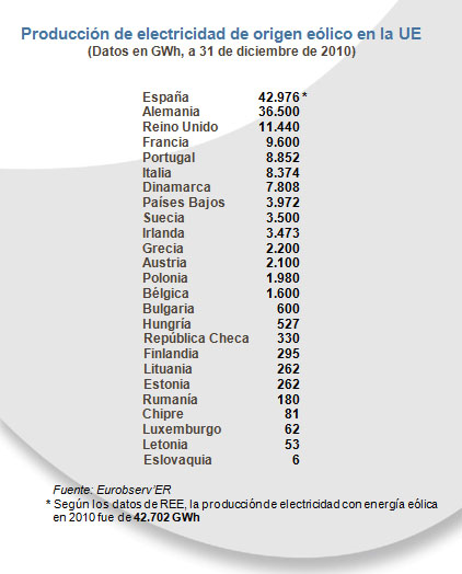 La generación de electricidad con energía eólica en 2010 alcanzó en España los 42.976 GWh, lo que supone que, por primera vez en su historia, superó a Alemania -36.500 GWh- como el primer productor europeo de energía eólica, según los datos del Barómetro Eurobserv’ER, el observatorio de energías renovables de la Comisión Europea.