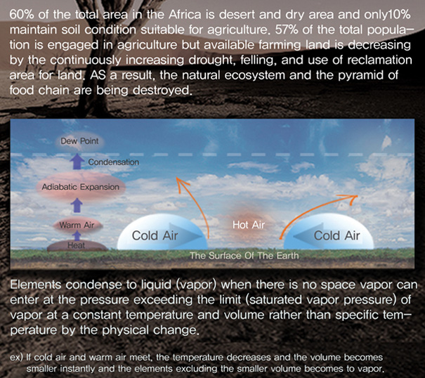 Se trata de un artefacto que utiliza la radiación solar y el potencial eólico como fuentes de energía para producir agua en desiertos mediante la condensación de agua extraída de la humendad del aire.