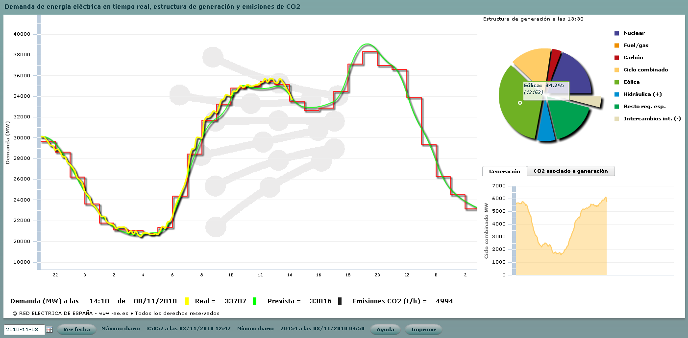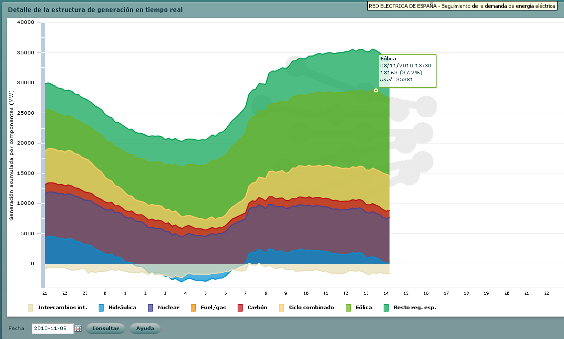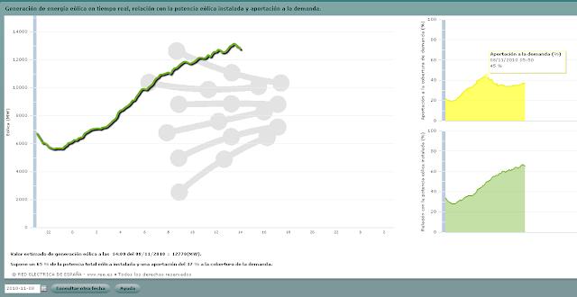 Hoy, lunes 8 de noviembre de 2010, la producción de energía eólica ha alcanzado un nuevo máximo de potencia instantánea: 13.163 MW a las 13.30 horas. El anterior máximo se produjo el pasado 24 de febrero, con 12.916 MW a la 11.20 horas. No se descarta que estos valores sean superados a lo largo del día, además de alcanzar máximos de potencia horaria y diaria.