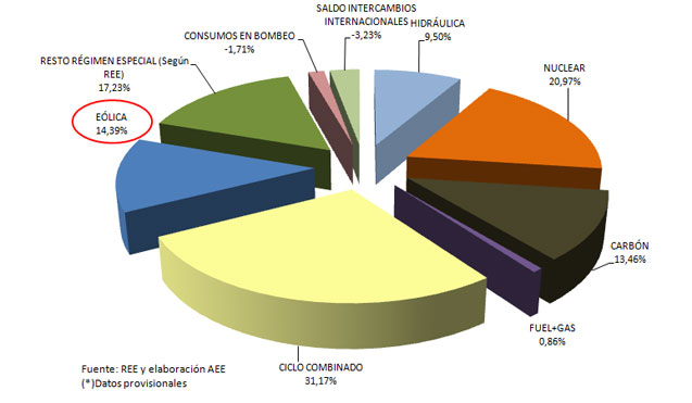 La eólica ha superado por primera vez en el cómputo global anual al carbón. En el conjunto del año, la energía eólica ha cubierto el 14,39% de la demanda frente al 11,5% de 2008.