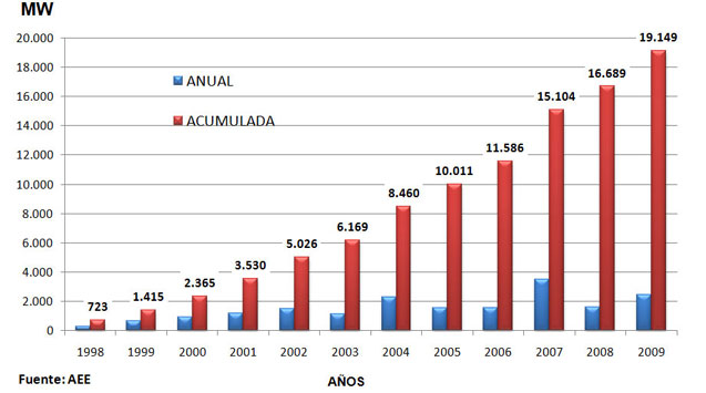 EVOLUCIÓN ANUAL Y ACUMULADA DE LA POTENCIA EÓLICA. 1998-2009