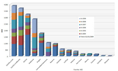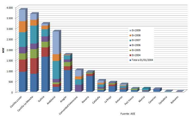 Por comunidades autónomas, Castilla y León, con un total de 3.882,72 MW acumulados ha arrebatado el liderazgo a Castilla-La Mancha, que con 3.699,61 MW queda segunda, seguida de Galicia, con 3.231,81 MW (sólo 91,5 MW instalados en 2009).