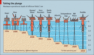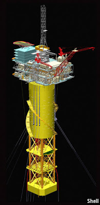 En 2008 Shell colocó en el Golfo de México la plataforma de la imagen (de nombre Perdido). Casi tan alta como la Torre Eiffel, encadenada a los fondos marinos por debajo de 2.400 metros, y está conectado a pozos submarinos cercanos, en el agua más profunda, a una profundidad de 2.900 metros.