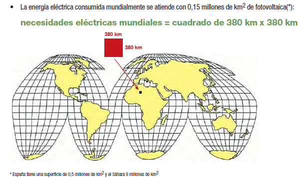 A modo de curiosidad, para poder cubrir la demanda eléctrica (270 TWh) totalmente por fotovoltaica (120 kWh/año), se necesitaría el 1,1% del territorio, es decir unos 5.500 km2 (la superficie de La Rioja aprox.)