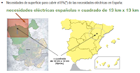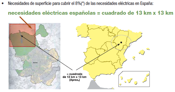• Necesidades de superficie para cubrir el 8% de las necesidades eléctricas en España: 180.000.000 m2, es decir, un cuadrado de 13 km x 13 km.