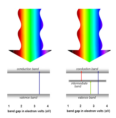 La capacidad de una célula solar para convertir la luz solar en corriente eléctrica es limitada por las deficiencias banda de los semiconductores de la que se hace. Por ejemplo, los semiconductores de banda ancha con espacios responden a longitudes de onda más corta, con energías más altas (inferior izquierda). Un semiconductor con una banda intermedia tiene múltiples lagunas banda y puede responder a una serie de energías (inferior derecha).